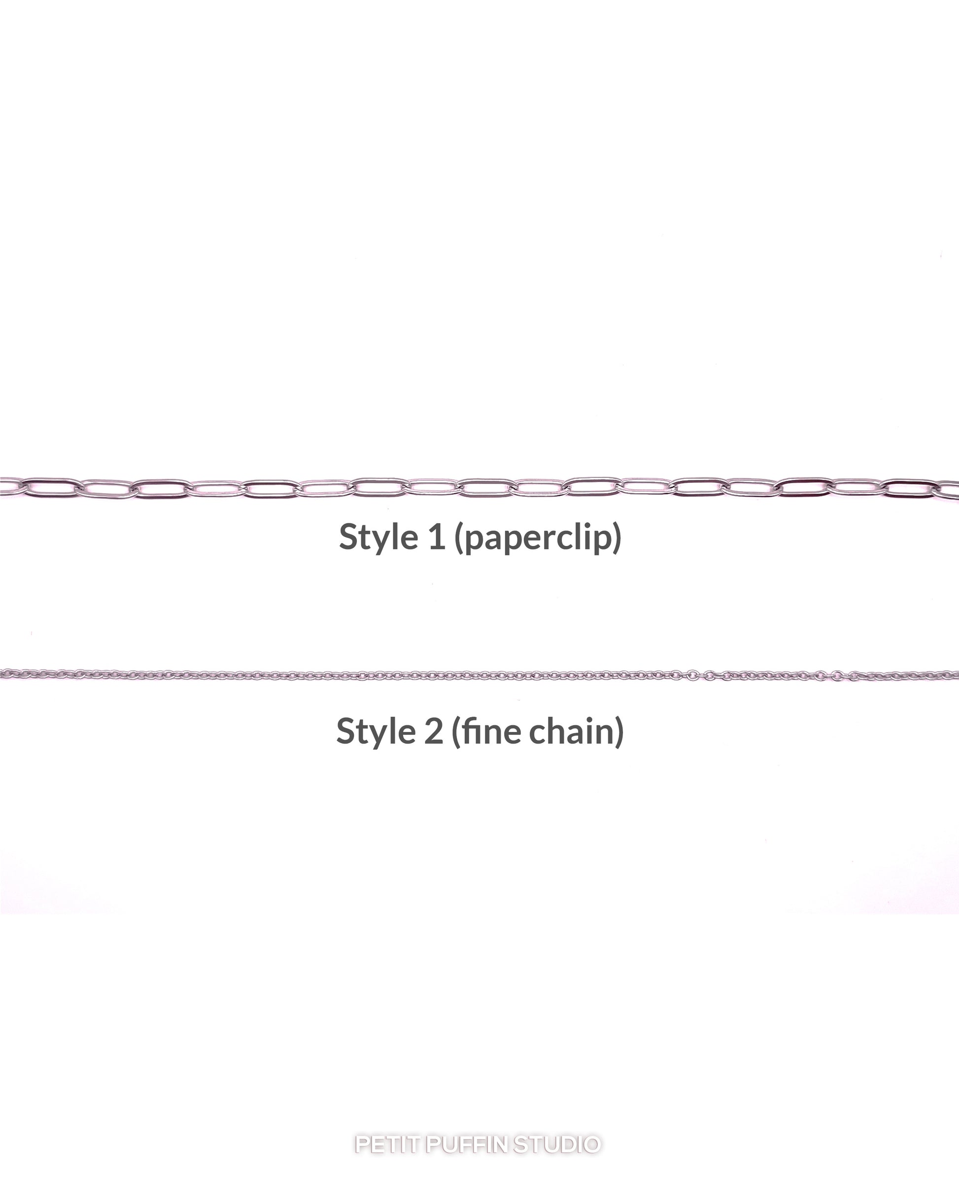 - chaîne trombone (paperclip) : environ 41 cm + chaîne d'extension de 5 cm. La chaîne d'extension peut être rallongée sur demande.