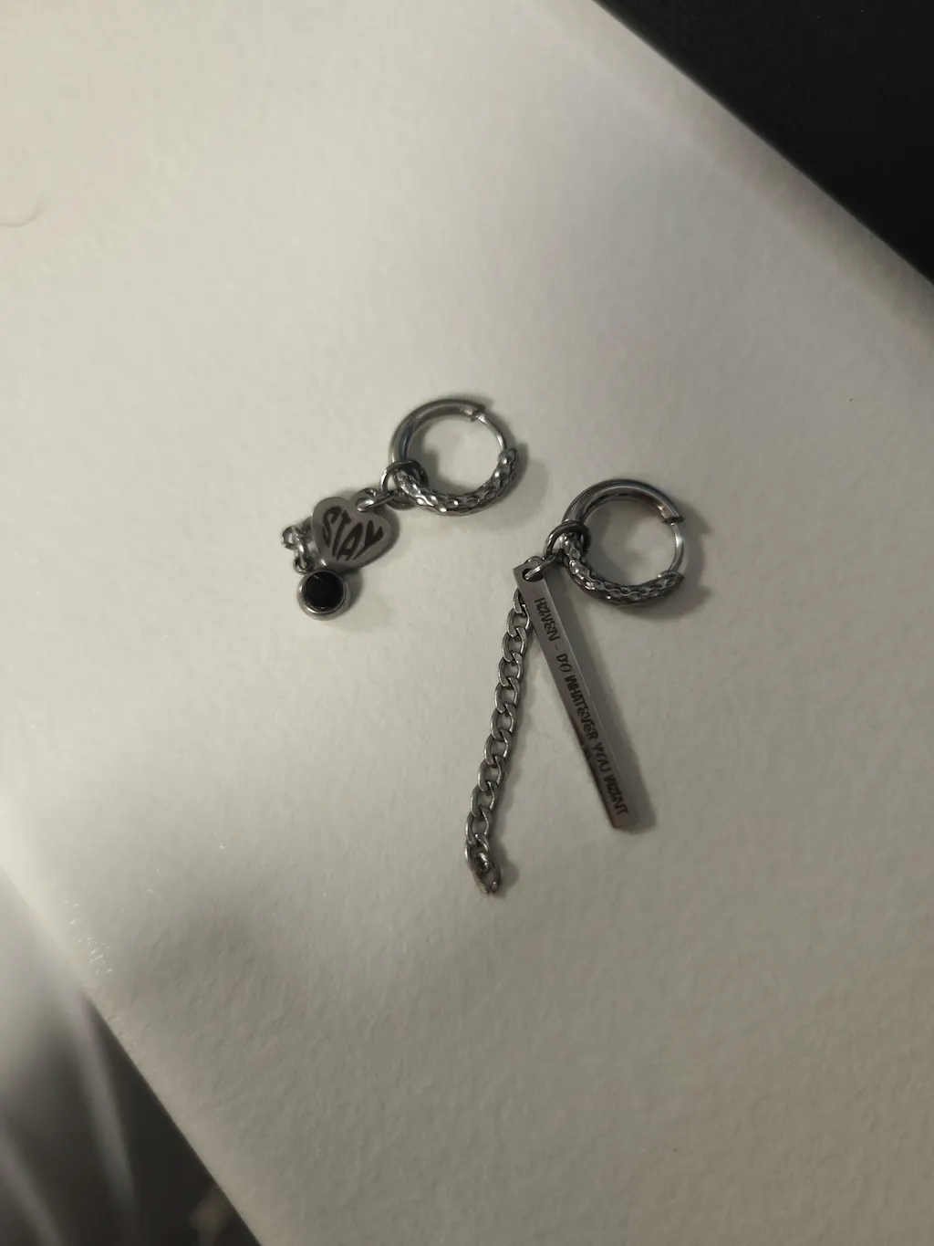 Choisissez la couleur de votre charm, la phrase sur la boucle d'oreille "barre" et le fandom pour la boucle d'oreille "coeur" :)